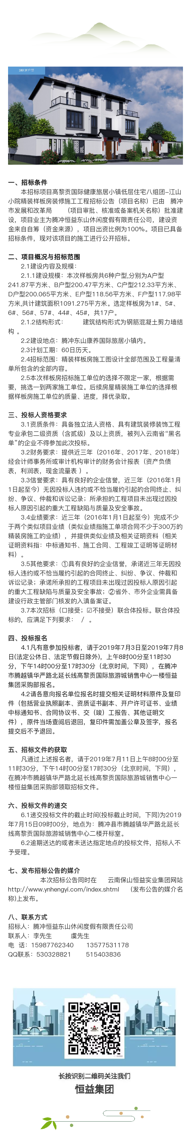 高黎貢國際健康旅居小鎮(zhèn)低層住宅八組團-江山小院精裝樣板房裝修施工工程招標(biāo)公告 來源: 瀏覽量:11529 日期:2019-07-04 分享到: 上一篇:高黎貢國際健康旅居小鎮(zhèn)低層住宅八組團—江山小院門頭及圍墻工程招標(biāo)公告 下一篇:騰沖市恒益礦產(chǎn)品經(jīng)貿(mào)公司關(guān)于鋅精礦競價銷售公告(201904)號