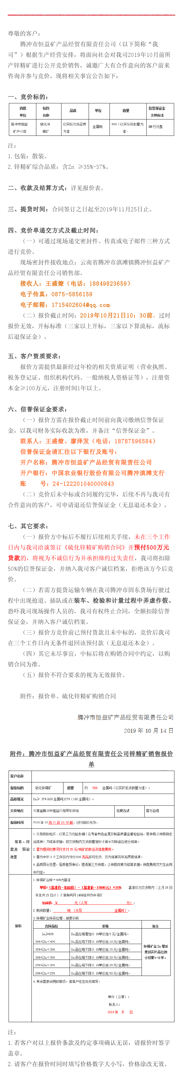 騰沖市恒益礦產(chǎn)品經(jīng)貿(mào)有限責任公司關(guān)于鋅精礦競價銷售公告(201905)號 來源: 瀏覽量:10849 日期:2019-10-14 分享到: 上一篇:騰沖市恒益礦產(chǎn)品經(jīng)貿(mào)有限責任公司關(guān)于鋅精礦競價銷售公告(201910)號 下一篇:騰沖市恒益礦產(chǎn)品經(jīng)貿(mào)有限責任公司關(guān)于鋅精礦競價銷售公告(201905)號