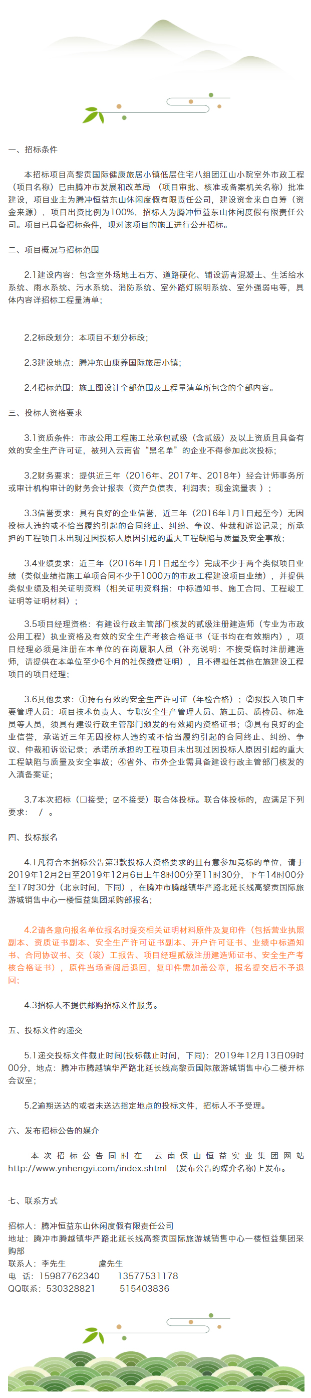 高黎貢國(guó)際健康旅居小鎮(zhèn)低層住宅八組團(tuán)江山小院室外市政工程施工招標(biāo)公告 來源: 瀏覽量:11399 日期:2019-12-02 分享到: 上一篇:高黎貢國(guó)際健康旅居小鎮(zhèn)低層住宅八組團(tuán)——景秀東山A區(qū)建筑消防工程施工招標(biāo)公告 下一篇:騰沖市恒益礦產(chǎn)品經(jīng)貿(mào)有限責(zé)任公司關(guān)于鋅精礦競(jìng)價(jià)銷售公告(201911)號(hào)