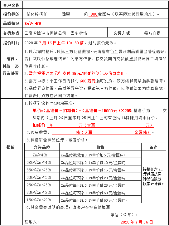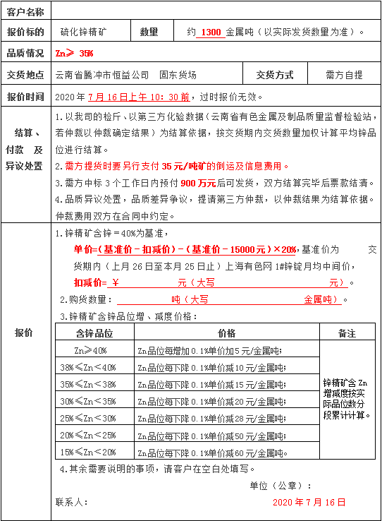 附件:騰沖市恒益礦產(chǎn)品經(jīng)貿(mào)有限責任公司鋅精礦銷售報價單