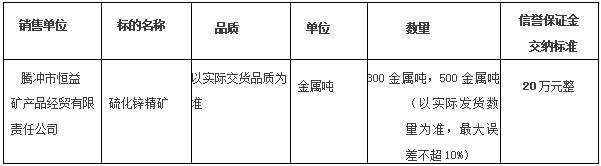 騰沖市恒益礦產(chǎn)品經(jīng)貿(mào)有限責(zé)任公司(以下簡(jiǎn)稱(chēng)“我司”)根據(jù)生產(chǎn)經(jīng)營(yíng)安排,將面向社會(huì)對(duì)我司2020年10月前所產(chǎn)鋅精礦進(jìn)行公開(kāi)競(jìng)價(jià)銷(xiāo)售,誠(chéng)邀廣大有合作意向的客戶(hù)前來(lái)咨詢(xún)并參與競(jìng)價(jià),現(xiàn)將相關(guān)事宜公告如下: