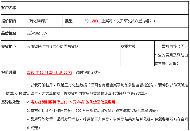 附件 騰沖市恒益礦產(chǎn)品經(jīng)貿(mào)有限責(zé)任公司 鋅精礦銷(xiāo)售報(bào)價(jià)單