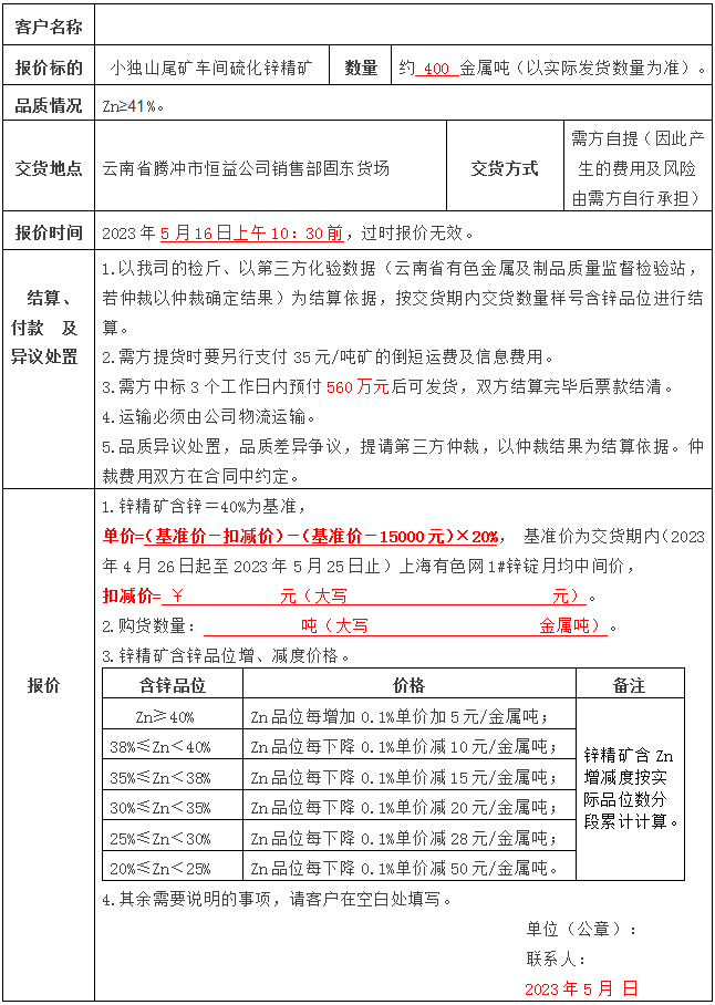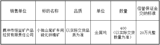 騰沖市恒益礦產(chǎn)品經(jīng)貿(mào)有限責任公司關于鋅精礦競價銷售公告(202304)號
