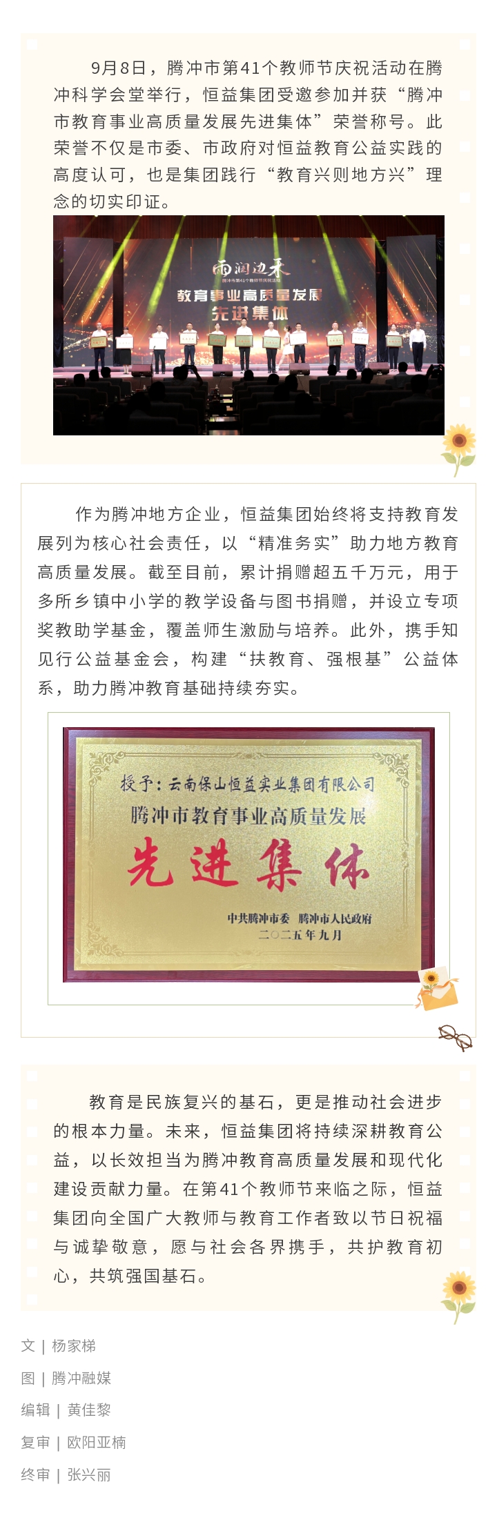 喜訊丨恒益集團(tuán)榮膺2025年“騰沖市教育事業(yè)高質(zhì)量發(fā)展先進(jìn)集體”稱號 來源: 瀏覽量:2548 日期:2025-09-08 分享到: 上一篇:恒益集團(tuán)與省心說科技達(dá)成合作 共筑微信電商新生態(tài) 下一篇:恒益集團(tuán)濱鯤中智與猴橋鎮(zhèn)簽約 共筑高原高端淡水魚養(yǎng)殖基地